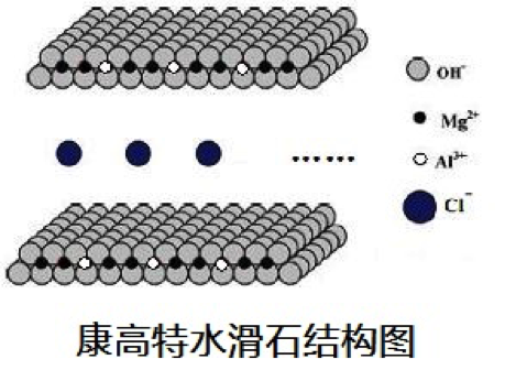 水滑石类化合物包括水滑石(Hydrotalcite,HT)和类水滑石(Hydrotalcite一LikecomPounds,HTLcs),水滑石结构一般由两种金属的氢氧化物构成,又称为层状双金属氧化物(LayeredDoubleHydroxide,LDH)。水滑石结构的插层化合物称为插层水滑石。水滑石、类水滑石和插层水滑石统称为水滑石类插层材料(LDHs)[1