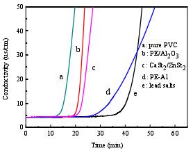 由于加热温度较高纯PVC很快就会降解释放出HCl,体系中HCl含量的增加会加速PVC的降解,因此当加热15.11min 时纯PVC组电导率迅速增加,热稳定曲线增长趋势呈直线状,即PVC降解速率迅速增大,产生 HCl 的含量骤增;