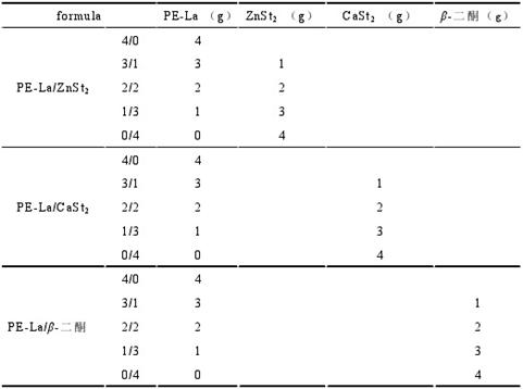 由于季戊四醇镧制备过程中需要氧化镧,而此种原料的价格比较昂贵,且为不可再生资源,因此本文采用复配的方法来节约资源,降低生产成本,其中选择的复配稳定剂为ZnSt2、CaSt2和邻苯二甲酰甲烷(β-二酮),采用刚果红法,电导率法,热重分析法和烘箱热老化法来测试几种稳定剂的协同作用。固定热稳定剂的总量为每100gPVC/4g热稳定剂,其中,选择季戊四醇镧/ZnSt2、CaSt2、β-二酮的比例分别为4/0、3/1、2/2、1/3、0/4,复配稳定剂配方如表3-15所示。