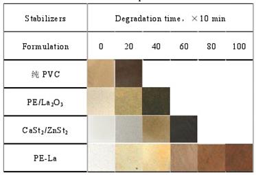 如表所示,纯PVC和PE/La2O3在压片过程中就会发生颜色的变化,纯PVC在加热20min之后完全变黑,而当PE/La2O3加热至40min时,完全变黑;CaSt2/ZnSt2体系当加热到60.0min时才会变黑;相比之下,自制季戊四醇镧抑制PVC变色能力是最强的,变黑时间能延长至100.0min,而且季戊四醇镧体系的抗初期着色能力很强,因此初期很白。