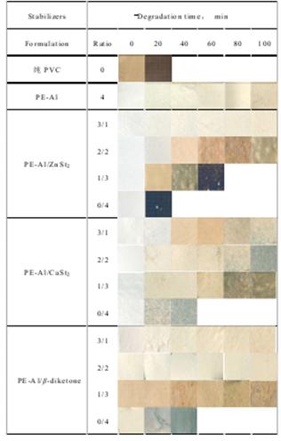 从表中可以看出纯PVC抗初期着色能力特别差,在加工过程中颜色就会发生变化;随着热稳定剂的加入,初期颜色逐渐变好,尤其是当季戊四醇铝与ZnSt2、CaSt2复配之后初期颜色非常白;随着加热时间的延长,纯PVC在加热20min之后完全变黑。