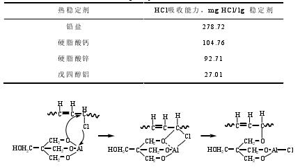 通过上述实验可以得知季戊四醇铝可以显著改善PVC热稳定能力,作为热稳定剂一般有两种机理:(1)取代PVC链中活泼的氯原子(反应方程7);(2)中和PVC降解放出的HCl抑制HCl的自催化作用(反应方程8)。为了明确季戊四醇铝