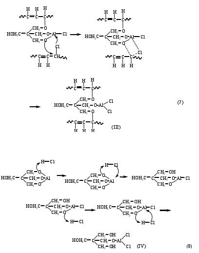 通过计算(如表3-11所示),得出1g季戊四醇铝吸收27.01mgHCl,1g硬脂酸锌吸收92.71mg盐酸,1g硬脂酸钙吸收104.76mg盐酸,1g铅盐稳定剂吸收278.72mg,这说明季戊四醇铝吸收HCl的能力比CaSt2、ZnSt2以及铅盐弱,而季戊四醇铝可以很好的改善PVC的热稳定性能,因此我们可以得出季戊四醇铝通过取代PVC链中活泼氯原子来改善PVC热稳定性能。因为PVC链中的氯原子电负性比较高(约为3.16)而季戊四醇铝中的Al原子电负性比较低(约为1.61),因此使反应比较容易进行,形成稳定的络合物(III)。