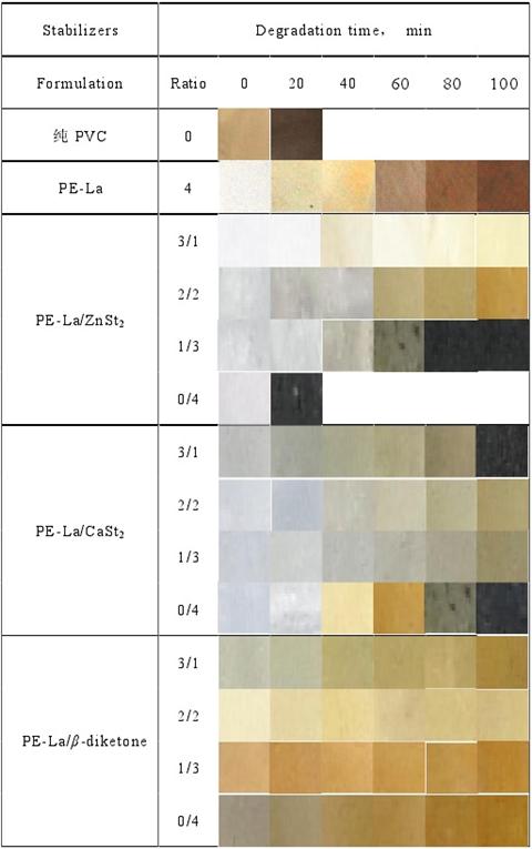 对 季戊四醇镧/ZnSt2来说初期颜色比较好,当两者比例为3/1时长期稳定性也很好,然而随着ZnSt2含量的增加长期稳定性逐渐减弱,当比例为0/4时,在加热20min之后就完全变黑;对季戊四醇镧/CaSt2来说初期颜色也不错,但是长期稳定性不是非常理想,而针对季戊四醇镧/β-二酮来说整个加热过程中颜色变化不是很明显只是稍微加深。