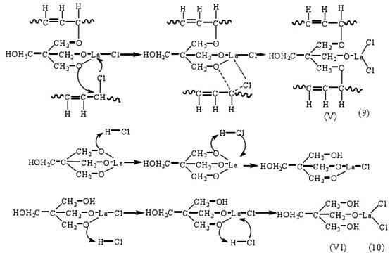 紫外分光光度实验中可以看出添加季戊四醇镧之后,共轭链的浓度显著减小,这说明季戊四醇镧直接和活泼氯原子反应从而在源头上抑制了共轭链的形成,而电导率实验中季戊四醇镧的加入可以显著的使诱导时间缩短也可以证明季戊四醇镧能够取代PVC链中的活泼氯原子,反应方程式如反应方程9所示,季戊四醇镧与PVC通过四元环过渡态形成络合物(V),由于空间位阻的原因,反应很难进一步继续,因此,反应中不会有LaCl3