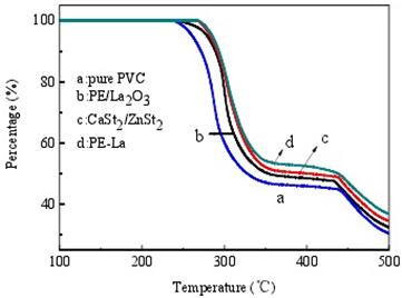 纯PVC的TG曲线显示在分解结束之后质量损失为70.1%,PE/La2O3从