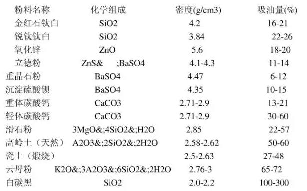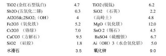 金红石 2.71 锐钛 2.55 硫化锌 2.37 氧化锌 2.02 立德粉 1.84 硅酸镁 1.65 陶土(白土) 1.65 重晶石(硫酸钡) 1.64 碳酸钙 1.63