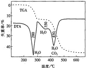水滑石受热时,低于200℃,仅释放少量结晶水;在280℃左右,释放的都是游离水(结晶水);高于350℃时,丢失水及碳酸根离子转化的C02;直到450℃左右,丢失的都是水和C02。低于500℃,分解过程仍是可逆的。水滑石热分解曲线如图1所示。