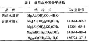 水滑石是一类具有特殊结构和性能的无机化合物结晶体,化学名称为碱式碳酸镁、铝水合物,英文名称为Hydrotalcite。自然界中所见到的自然状态的水滑石,数量很少,仅在俄罗斯、挪威等少数地区以矿物形式存在。由于此类化合物有独特的性质和特点,各国用化学合成方法,相继投人科研力量,研制出百余种结构不同的水滑石,其中一些品种已经投入工业化生产。水滑石作为新颖的化工产品,在化学工业、塑料工业、医药业中得到广泛的应用。