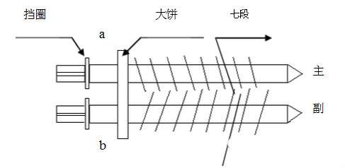 1\ 先分清主副螺杆,从后端向前端看两螺杆成人字形,然后把大饼装好,把两螺杆同时推入料筒,打入定位销,装好两螺杆的垫铁,把两螺杆的标记转到上支点,锁紧大螺母,把两螺杆的花键套全部上到位,这时先不要急于调整螺杆间隙,应先测定一下两螺杆是否处于自由运动状态,只有两螺杆在自由运动状态的情况下才能正确调整螺杆间隙(意思是说无论用顶板顶住主螺杆或顶住副螺杆,则另一螺杆都能前后运动)。怎样才能使两螺杆达到自由运行状态的测试方法:用顶板顶紧副螺杆或顶主螺杆,顶哪一个螺杆都一样,用撬杠拨动另一螺杆看是否能前后运动。例如:顶紧副螺杆,拨动主螺杆不能前后运动,这就是说主螺杆的垫铁太厚了,前后一点间隙都没有,双螺杆咬死了,然后松开副螺杆,再顶紧主螺杆,拨动副螺杆,副螺杆能前后运动,这就证明,副螺杆的垫铁太薄了,从上述得出应修掉主螺杆的垫铁或加副螺杆的垫铁,一般加或减0.5mm左右(申威达机器的螺杆与螺杆的间隙不得小于0.3mm)。修整好后,再顶紧一螺杆,拨动另一螺杆,看两螺杆是否处于自由运动状态,如是就可以进行下一步工作,否则再进一步调整。