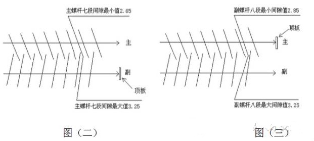 2、图(二)和图(三)分别用塞尺测量出七、八段两螺杆的最小间隙和最大间隙的数据,分别计算出两螺杆的串动量。测量和计算的方法: