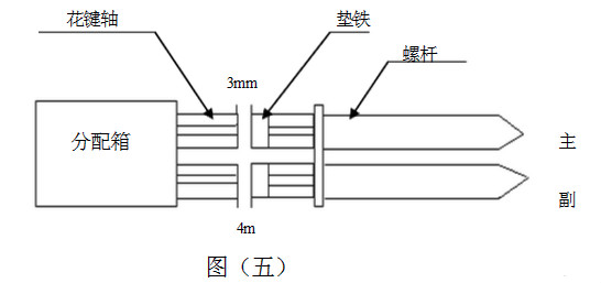 (3)松开花键套、顶板、大螺母,用塞尺(两支)分别塞好七、八段间隙分别是2.20/2.30,再用铜棒轻打几下两螺杆,使螺杆与料筒无间隙,锁紧大螺母,用内千分尺分别量出两螺杆的垫铁到分配箱两花键轴的距离(图五)分别是主:3mm,副4mm。