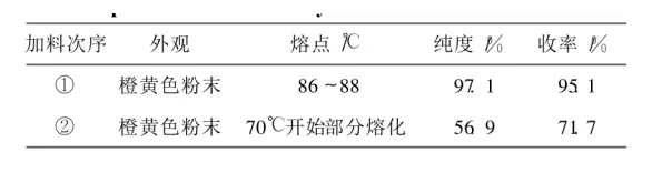 皂化阶段的加料次序分为两种:①先加氢氧化钠溶液,后加硬脂酸;②先加硬脂酸和水,后加氢氧化钠溶液。在整个硬脂酸铁合成过程中 ,硬脂酸 、氢氧化钠和三氯化铁三者的投料比(质量比)保持恒定,硬脂酸钠的复分解反应温度固定 70℃不变。皂化反应阶段的加料次序对硬脂酸铁合成的影响见表 1。
