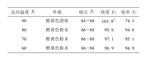 由于硬脂酸铁熔点为 86 ~ 88℃, 为了能让它更好地沉淀下来 ,反应温度应控制在其熔点之下,否则熔化的硬脂酸铁会浮到液面上, 对加入的三氯化铁形成包裹 ,产物中铁含量增多 ,导致硬脂酸铁含量测定偏高。实验还发现 , 如果反应温度达到 90℃, 得到的硬脂酸铁产物熔点会有所降低 , 这可能是由于熔融的硬脂酸铁在高温条件下发生部分水解, 产生了少量硬脂酸 。
