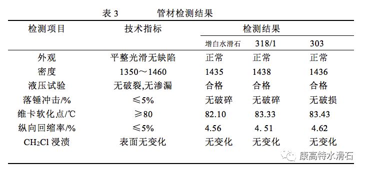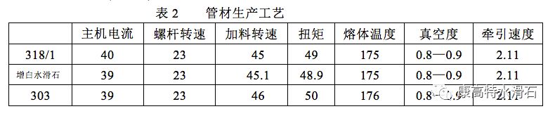 康高特增白水滑石生产的硬质PVC塑料管材时,它的加工性能和熊牌318/1、国内某公司的303几乎一样,制品的物理性能都完全能达到国家标准的有关规定;从主机电流和螺杆扭矩以及熔体压力来看,三者的主机运行都很平稳,熔体流动性同样好,塑化性能优良,表面光洁度高,连续生产稳定性好、耐候性优良。